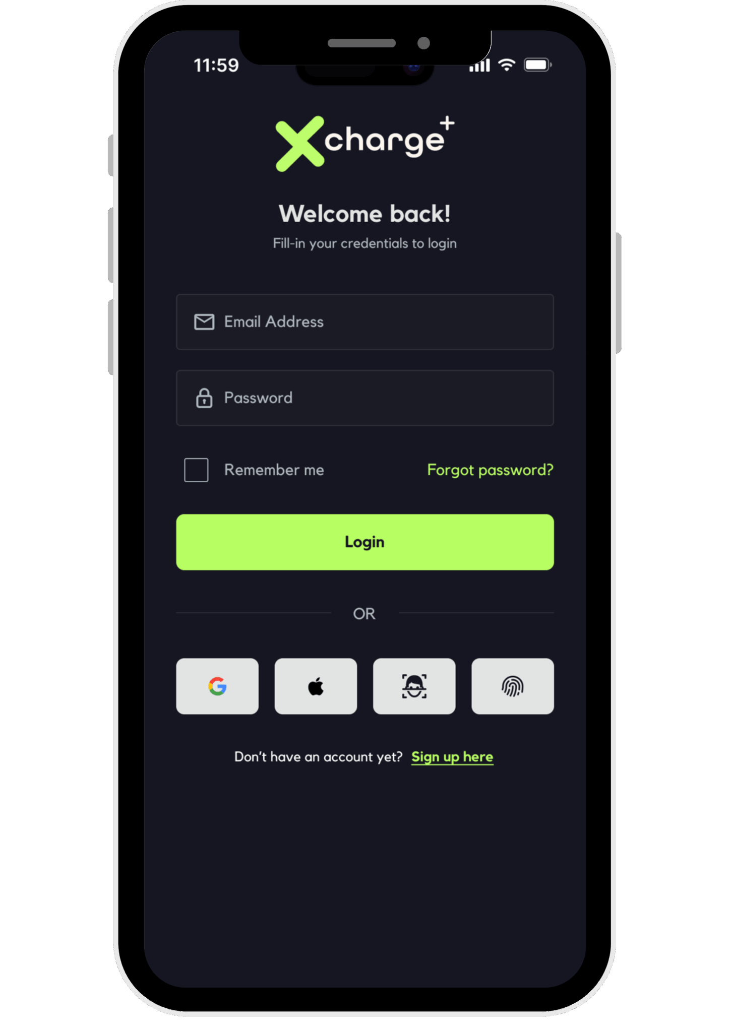 Access the EVOxCharge app by logging in with your email or quickly creating a new account to start charging.