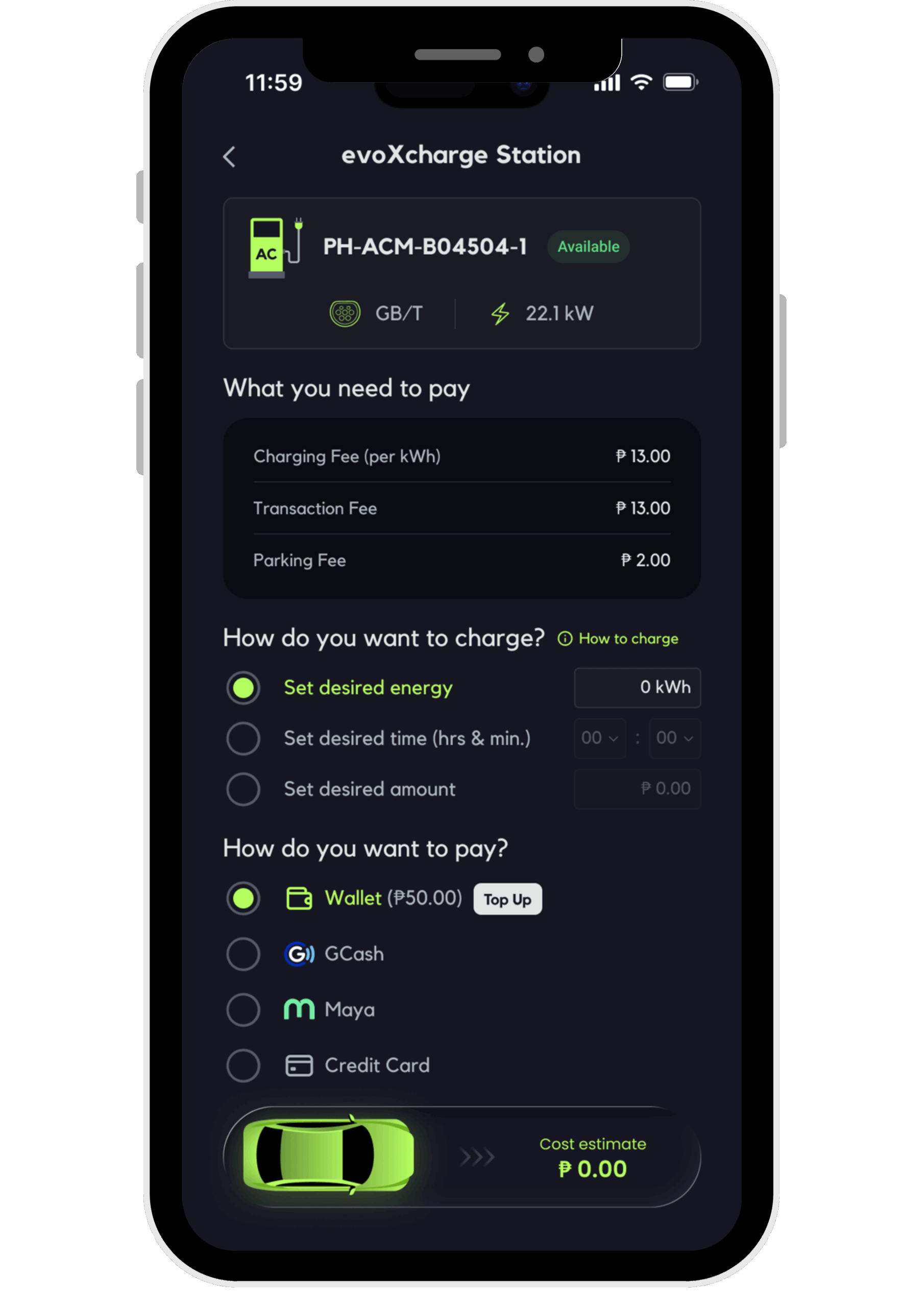 Choose charging type, set energy limits, and pick your preferred payment method — GCash or credit card.